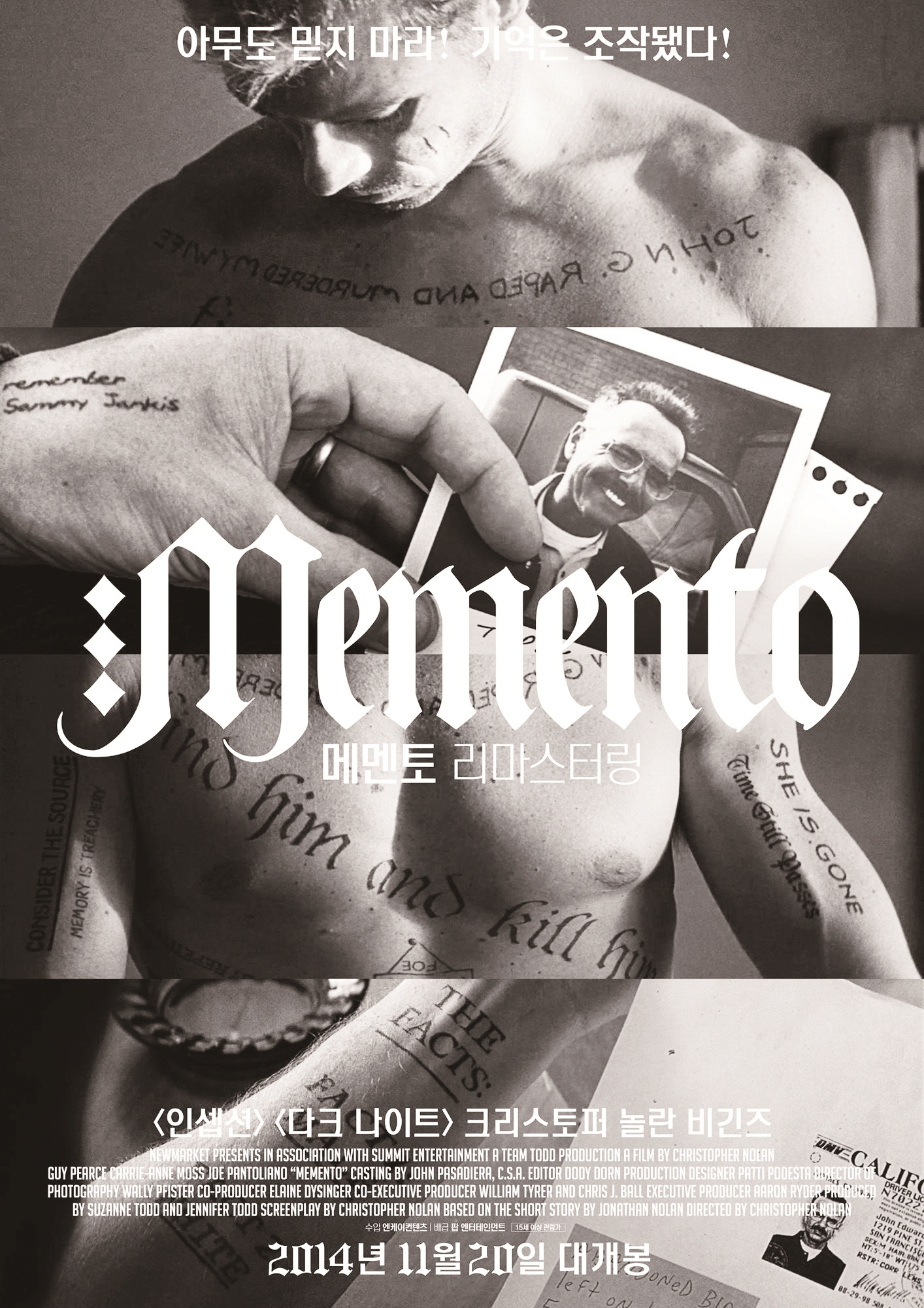그래서 그는 자신의 몸에 타투를 새기고, 폴라로이드 사진을 찍어 단서를 기록합니다.